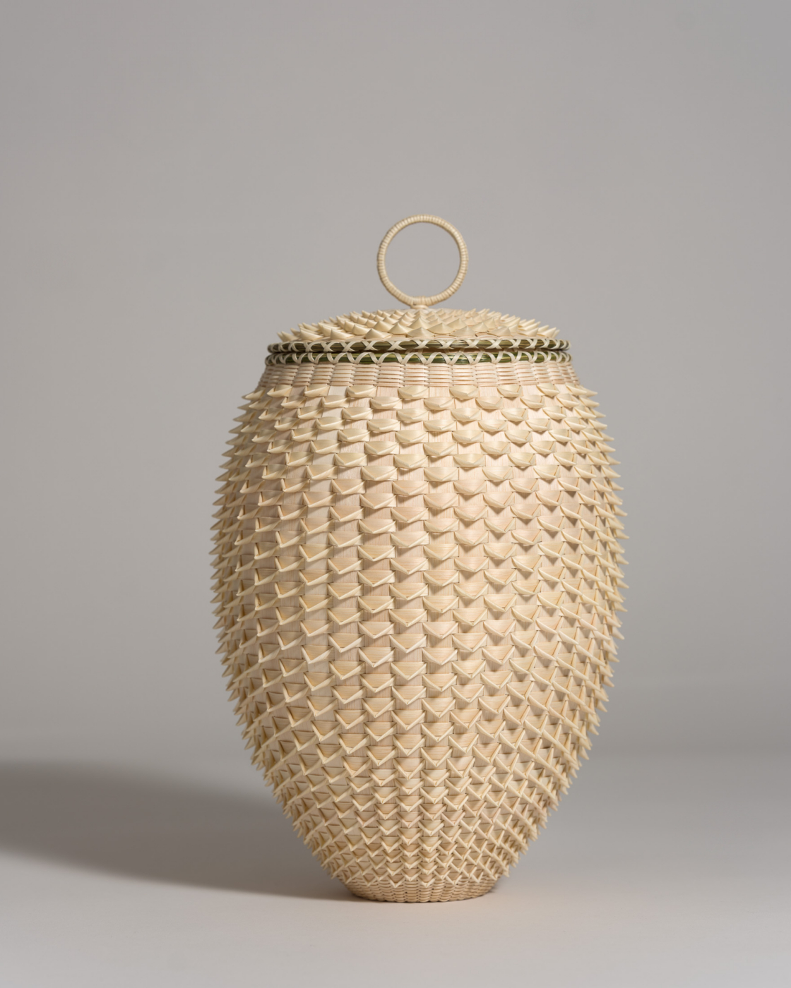 Jeremy Frey (b. 1978, Passamaquoddy Indian Township Reservation, Maine) is one of the foremost Passamaquoddy craftspeople of his generation. A descendant of a long line of Indigenous weavers, Frey learned traditional Wabanaki methods from his mother and by apprenticing at the Maine Indian Basketmakers Alliance. Woven from natural materials that the artist himself forages, such as sweetgrass and wood from black ash trees, Frey’s vessels are characterized by subtle forms, delicately layered colors, and elaborate weaves. Building on and experimenting with the material histories of Wabanaki basketry, his work is also in dialogue with contemporary sculpture’s emphasis on materiality, form, and variation within repetition. To create his basket relief prints, Frey has developed a novel form of flat weaving that can be run repeatedly through a printing press, preserving and sharing his techniques without impacting the stock of his rare materials. Frey lives in Maine.