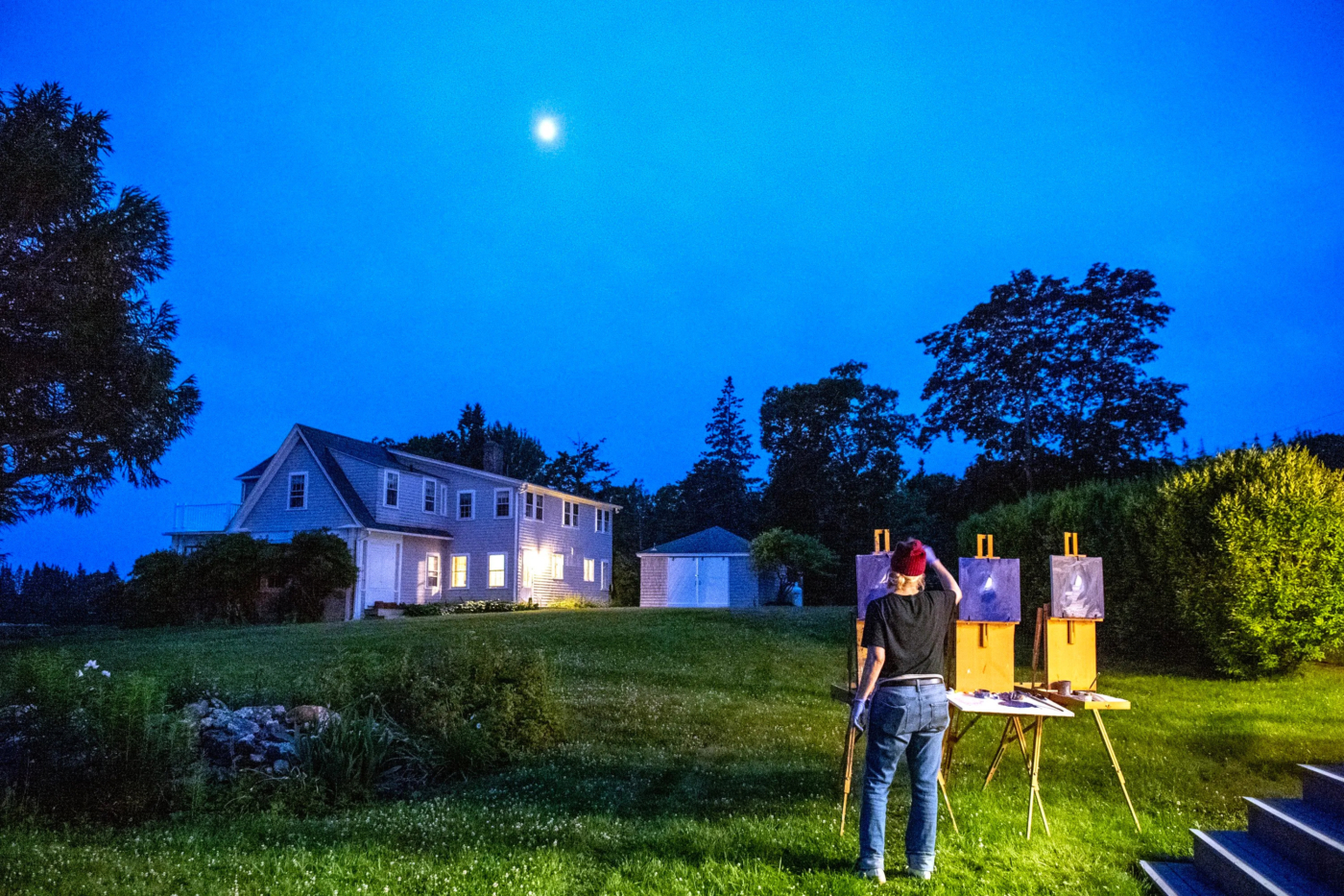 On this particular July day, she wasn’t sure the moon would make an appearance. The forecast had threatened a thunderstorm. But the evening stays dry, so she props the easels in the yard right next to her studio. Her paintings, including those on view in three Maine museums this summer, are often quite large. But she always starts with these small studies, working on multiple canvases at the same time as the moon rises.
