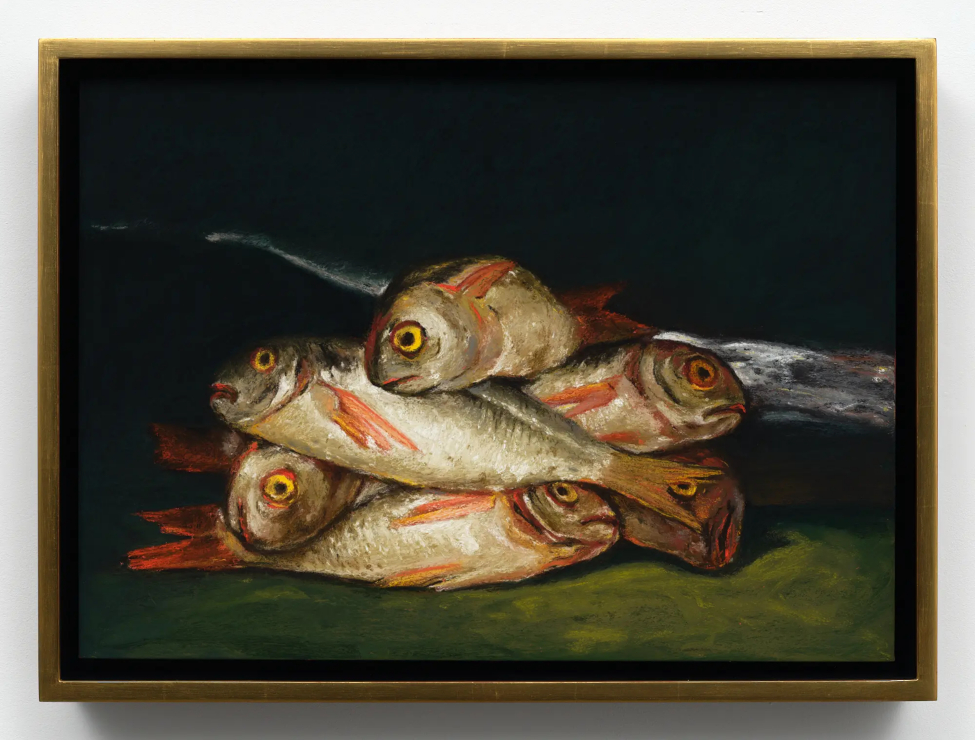 The first image the visitor sees is Still Life with Golden Bream, after Francisco de Goya (2025), a pastel on linen. We might assume this to be a copy of Goya’s Still Life with Golden Bream (1808–1812) oil on canvas, but it isn’t. Party uses pastel instead of oil and changes, ever so slightly, the dimensions of the original—his is 17 ¾ by 24 ¾ inches, while Goya’s is 17 ⅝ by 24 ⅝inches—as if to illustrate Jacques Derrida’s concept of iterability, where repeating a term simultaneously states the original while subtly altering or changing it. Repetition, like translation, confers a Janus-like identity on the word or image replicated: it looks backward to earlier meanings while heralding new ones. This is the operative conceit of Party’s daring show.