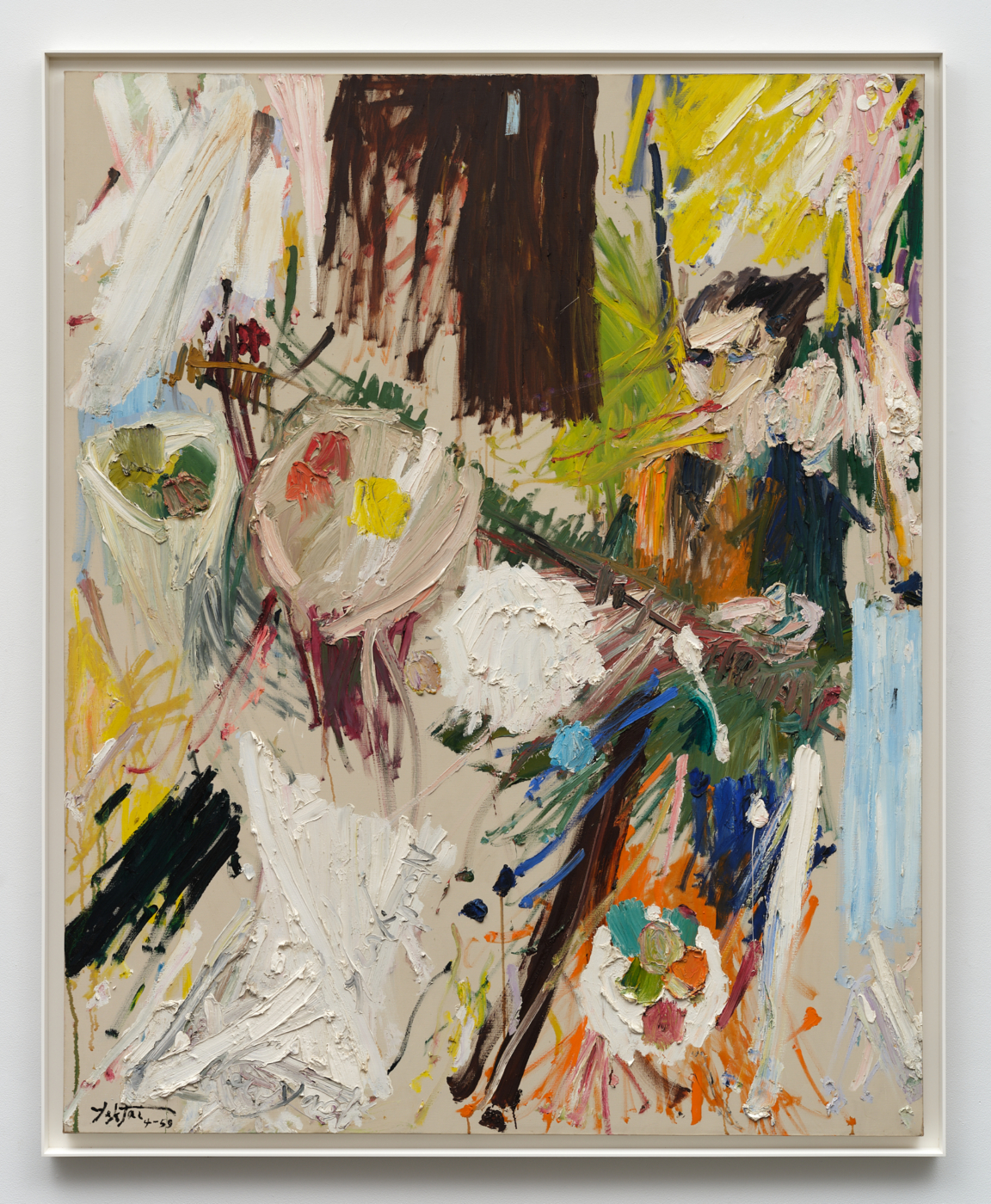 Yektai moderates that intensity in Untitled (1954), concentrating color at the center of a larger canvas, more than five feet tall, surrounded by restless swipes of white, taupe, and sand. As if giving substance to space itself, creamy drags of paint both surround and support a cluster of orange and violet marks-perhaps incipient fruit, like those that would later populate his tablescapes. Beside it, another untitled work from the same year exemplifies his preference for alla prima painting, wet pigments layered in quick succession: Undulating ribbons of lavender and cerulean streak across slabs of white, while floral whirls of pastel pink and orange are limned with adjacent shades of marigold and chartreuse. The startling pictorial depth dares viewers to reach out, run their fingers across the viscous topography of color.